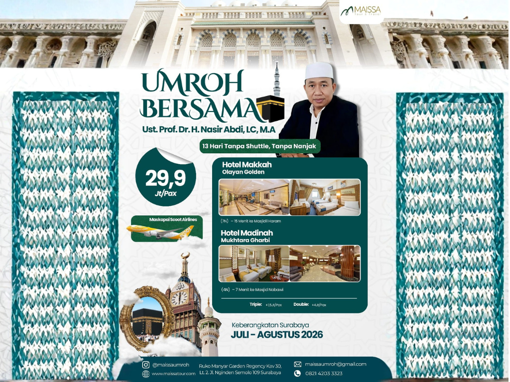 - Perlengkapan : Koper kabin, koper bagasi, tas paspor, kain ihram/mukena, sandal, buku manasik, kain seragam, syal, & sabuk
